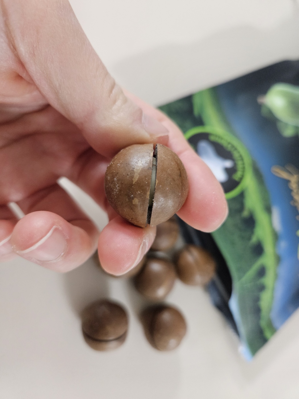 마카다미아의 주요 특징 중 하나는 단단한 껍질입니다. 자연 상태에서는 껍질이 매우 단단하여 손쉽게 깨먹기 어려우며, 대부분 가공된 상태로 유통됩니다. 껍질을 벗기면 둥글고 매끈한 크림색 씨앗이 나오는데, 바로 우리가 먹는 부분입니다.
